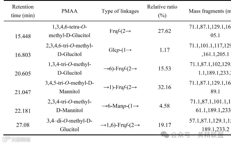 为了确定多糖链的糖苷键,进行PCP-80%的甲基化分析,我们发现,PCP-80%中Fruf-(2→和→1)-Fruf-(2→残基含量最高,分别为27.62%和32.16%,Glcp-(1→是PCP-80%糖链的末端残基(表1)。