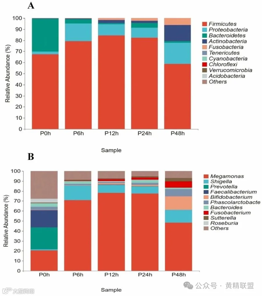 使用Mag-Bind土壤DNA试剂盒分离粪便微生物基因组DNA,PCR扩增和测序后进行聚类分析。通过Chao1指数、Simpson指数、Observed指数和Shannon index,发现PCP-80%对肠道微生物的影响,在发酵6 h时,PCP-80%组中肠道细菌群落的丰富度和多样性显著降低,即补充PCP-80%可能会导致某些特定细菌的数量增加,进而降低了肠道菌群的多样性和丰富度(表3)。PCP-80%能够提高Megamonas、Bifidobacterium和Phascolarctobacterium等有益菌属的相对丰度,从而提高益生活性(图3)。