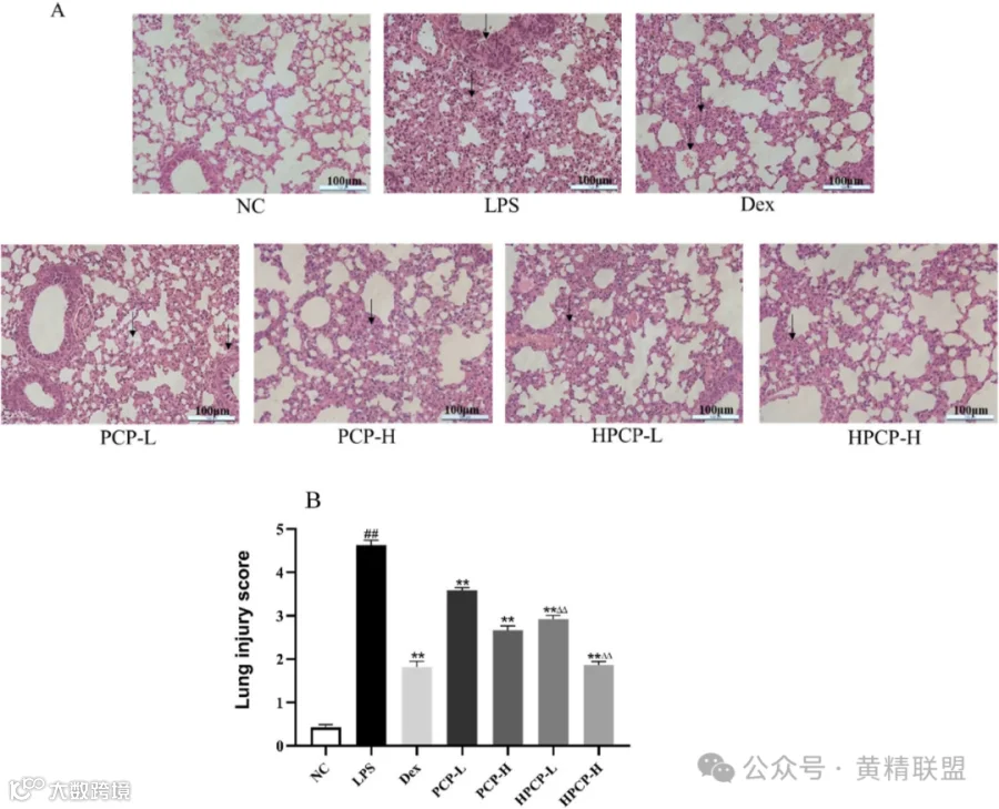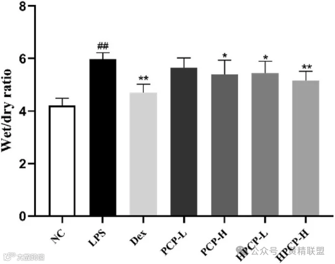 以小鼠为研究对象,将70只小鼠随机分为正常对照组(NC)、模型对照组(LPS)、地塞米松对照组(2 mg/kg/dw)(Dex)、PCP低剂量组(400 mg/kg/dw)(PCP - l)和高剂量组(800 mg/kg/dw) (PCP - h)、HPCP低剂量组(400 mg/kg/dw) (HPCP - l)和高剂量组(800 mg/kg/dw) (HPCP - h)。首先通过测量肺干湿比(W/D)评估肺水肿,发现LPS诱导的肺损伤小鼠(LPS组)肺W/D比显著高于NC组,说明肺损伤建立成功。其中HPCP - h组与Dex组间差异最小,疗效最强(见图3)。关于肺组织病理损伤,不同剂量的PCP和HPCP治疗后肺损伤均有明显改善,表现为肺间质增厚明显减少,中性粒细胞明显减少,肺泡壁变薄。与PCP相比,相同剂量下HPCP的病理改善更为明显(见图4)。
