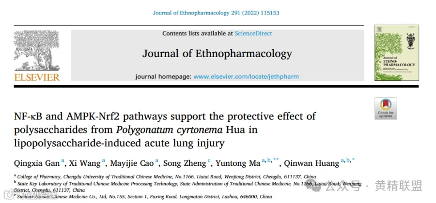 成都中医药大学、国家中医药管理局中药炮制工艺国家重点实验室及昆四川开美中药股份有限公司在《Journal of Ethnopharmacology》(JCR1区,IF=5.2)发表了“NF-κB and AMPK-Nrf2 pathways support the protective effect of polysaccharides from Polygonatum cyrtonema Hua in lipopolysaccharide-induced acute lung injury”的研究论文。