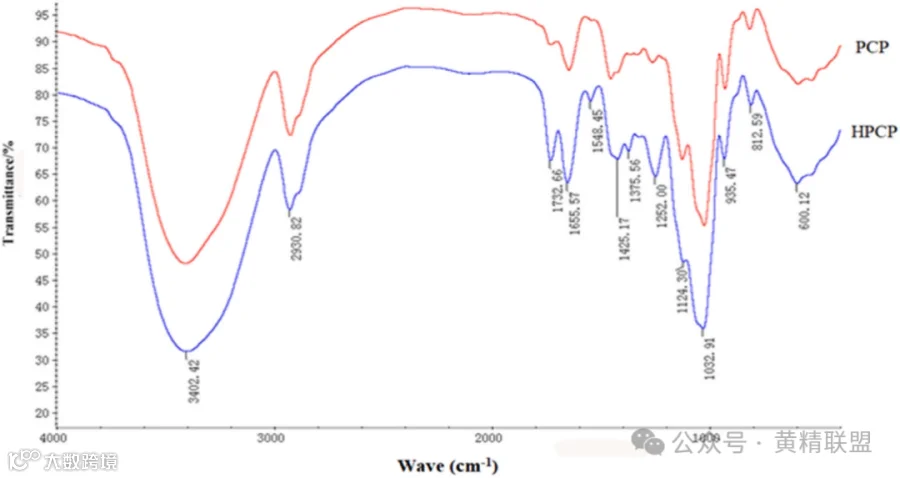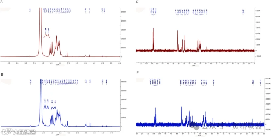 本文首先对PCP(polysaccharides from raw Polygonatum cyrtonema Hua, 多花黄精)与HPCP(polysaccharides from honey-processed Polygonatum cyrtonema Hua, 蜂蜜加工后黄精中的多糖)的结构进行了表征。PCP和HPCP的平均分子量分别为8.842×103 Da和5.521×103 Da,采用PMP-HPLC和Seliwanoff相结合的方法检测,推测PCP主要由果糖、葡萄糖和半乳糖组成,而HPCP主要由果糖、葡萄糖、半乳糖以及少量阿拉伯糖和木糖组成。红外图谱显示PCP和HPCP的官能团构型相似,但振动幅度不同,并且多糖在935和812 cm-1附近的吸收峰属于果糖,说明具有β型糖苷键(见图1)。同时,对两种多糖也进行了核磁共振分析,除了质子信号范围是多糖的典型特征外,两者均存在α与β构型的吡喃糖残基的异头氢,也具有β- d -果糖残基的信号。此外,HPCP在异头氢区发生了δ4.49的化学位移,表明存在末端半乳糖或1,4 -β-半乳糖(见图2)。