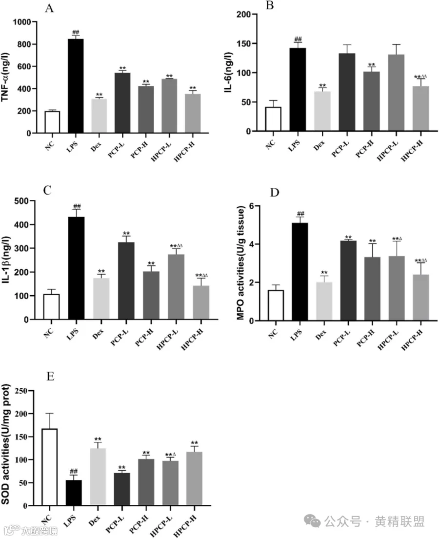 图5 PCP和HPCP可减轻lps诱导的ALI小鼠的炎症和氧化应激。检测BALF中TNF-α (A)、IL-6 (B)、IL-1β (C)水平,测定肺组织中MPO (D)和SOD (E)的活性