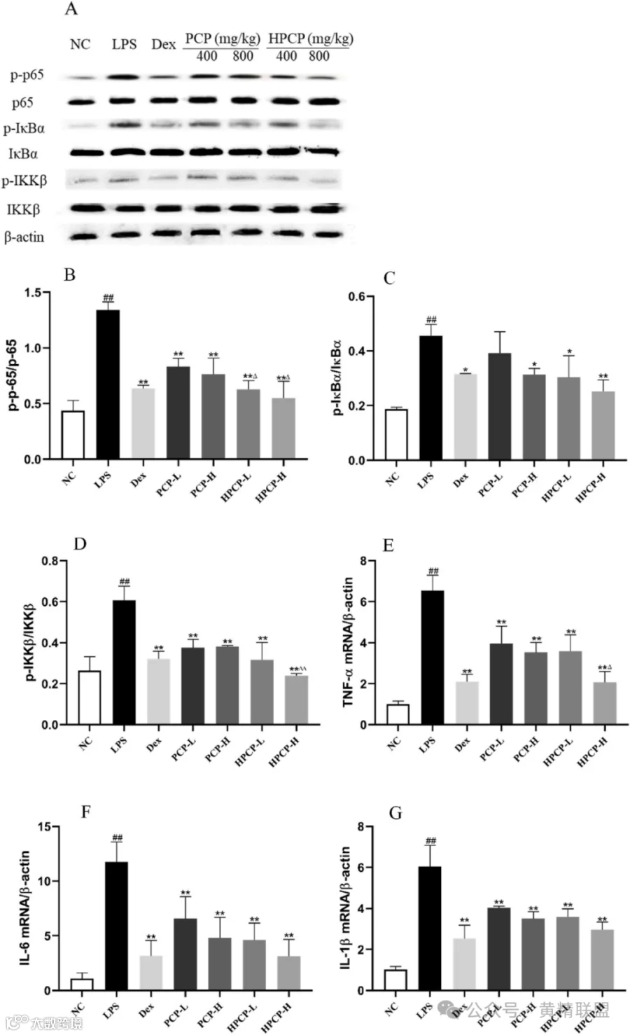 图6 PCP和HPCP对脂多糖诱导ALI小鼠NF- κB信号通路的影响。Western blot法检测肺组织p-IKKβ、p- κbα、p-p65蛋白水平(A-D),实时PCR检测大鼠肺组织中TNF-α (E)、IL-6 (F)、IL-1β (G) mRNA的表达