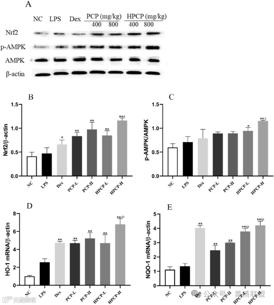 图7 PCP和HPCP对lps诱导ALI小鼠AMPK-Nrf2信号通路的影响。Western blot (A-C)检测肺组织中Nrf2、p-AMPK、AMPK蛋白水平,实时PCR检测大鼠肺组织HO-1 (D)、NQO-1 (E) mRNA表达