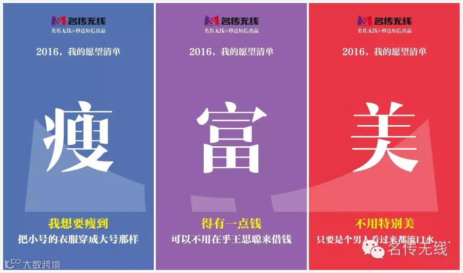点评:2015年即将过去了,得志的不得志的都会回顾一下自己今年到底都做了什么,做出了什么样的成绩。现实固然很骨感,但是乐观的人都会把希望放在下一年。名传无线的《2016,我的愿望清单》很巧妙地捕捉到了网民的这种微妙的小心理,用创意、新锐、逗B、调侃等极具恶趣的文字把大家幻想的东西表达出来,引发社交网络纷纷的分享狂潮。同时植入名传无线这个品牌的核心产品“秒达验证码短信”产品。这个传播做得也算独树一帜!可以是很多意做Social的民营企业做参考。