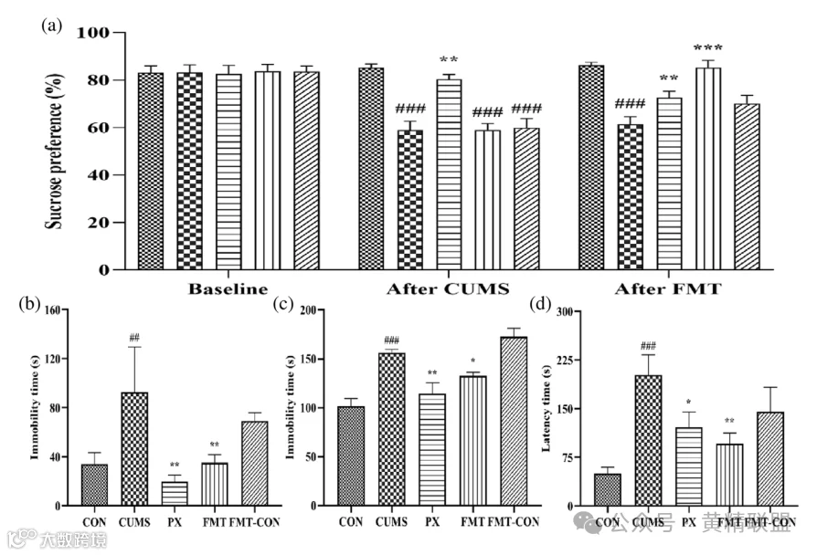 图 3 PSP相关粪便微生物群移植(FMT)对CUMS诱导小鼠抑郁样行为的影响。 (A) 蔗糖偏好试验(SPT)中的蔗糖偏好指数。 (B) 尾部悬吊试验(TST)中的不动时间。 (C) 强迫游泳试验(FST)中不动时间。 (D) 新颖性抑制进食试验(NFT)中进食潜伏期。