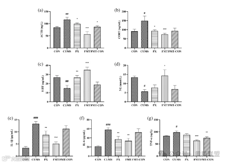 图 4 PSP相关粪便微生物群移植(FMT)对CUMS诱导小鼠HPA轴、神经递质和神经炎症的影响。(A) 血清促肾上腺皮质激素(ACTH)水平。 (B) 血清皮质酮(CORT)水平。(C) 海马5-羟色胺(5-HT)水平。 (D) 海马去甲肾上腺素(NE)水平。(E)海马白细胞介素(IL)-1β水平。(F) 海马IL-6水平。(G) 海马肿瘤坏死因子(TNF-α)水平。
