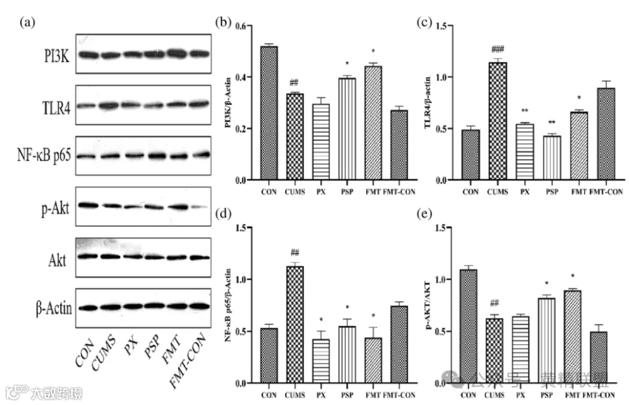 图 5 PSP和PSP相关粪便微生物群对CUMS诱导小鼠海马TLR4/NF-κB通路的影响。 (A) 有代表性的蛋白质条带;(B-E)PI3K/β-肌动蛋白(F(5,12)=48.77,p<0.001),TLR4/β-Actin(F(5,12)=60.23,p<0.001),NF-Κbp65/β-Actin(F(5,12)=17.62,p<0.001)and p-AKT/AKT(F(5,12)=34.68,p<0.001)in hippocampus。
