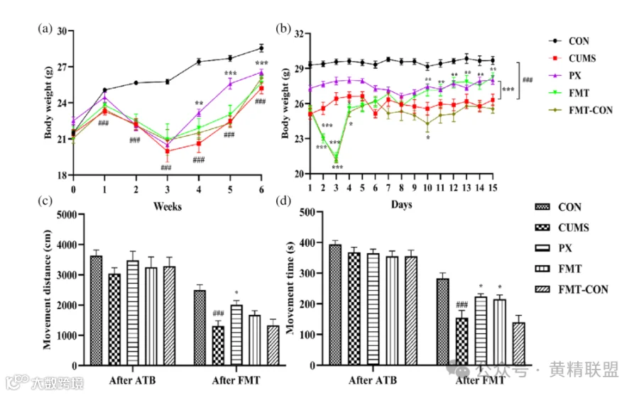 图 2 PSP相关粪便微生物群移植(FMT)对CUMS诱导小鼠体重和运动活性的影响。(A) 抑郁症建模阶段体重的变化;(B) 粪便微生物群移植(FMT)阶段体重的变化;(C) 野外试验中的移动距离(OFT);(D) 开放场地试验中的移动时间(OFT)。