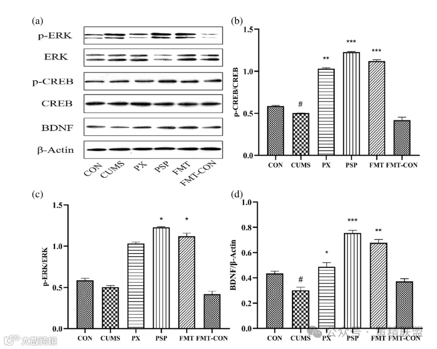图 6 PSP和PSP相关粪便微生物群对CUMS诱导小鼠海马ERK/CREB/BDNF通路的影响。 (A) 有代表性的蛋白质条带;(B-D) 在海马体中p-CREB/CREB的水平,p-ERK/ERK和BDNF/β-Actin。