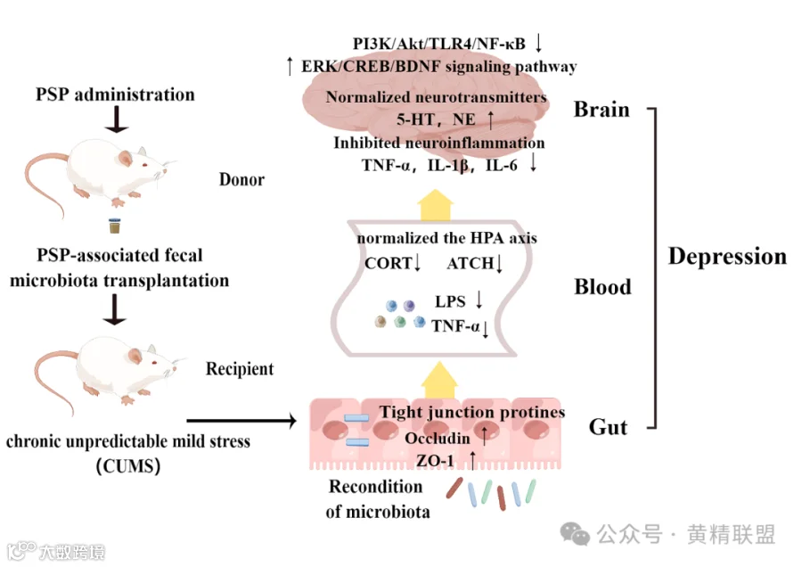 综上,本研究通过移植PSP给药小鼠的粪便微生物群(FMT),探讨PSP是否能通过微生物群-肠-脑(MGB)轴在慢性不可预测轻度应激(CUMS)诱导的抑郁小鼠中发挥抗抑郁样作用。FMT显著逆转了CUMS诱导的小鼠在开阔场地、蔗糖偏好、尾部悬吊、强迫游泳和新奇抑制喂养试验中的抑郁样行为。FMT显著增加了CUMS诱导小鼠血清中5-羟色胺和去甲肾上腺素的水平,降低了海马中促炎细胞因子的水平,并降低了促肾上腺皮质激素皮质酮的水平。