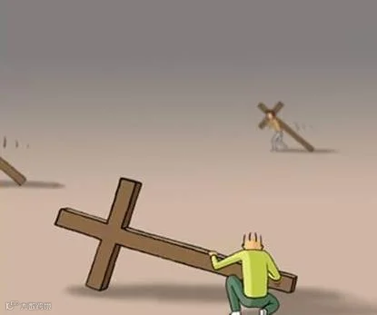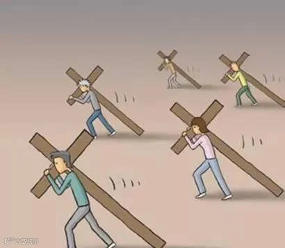 第一幅漫画中,每个人都背负着一个沉重的十字架,在缓慢而艰难地前行!