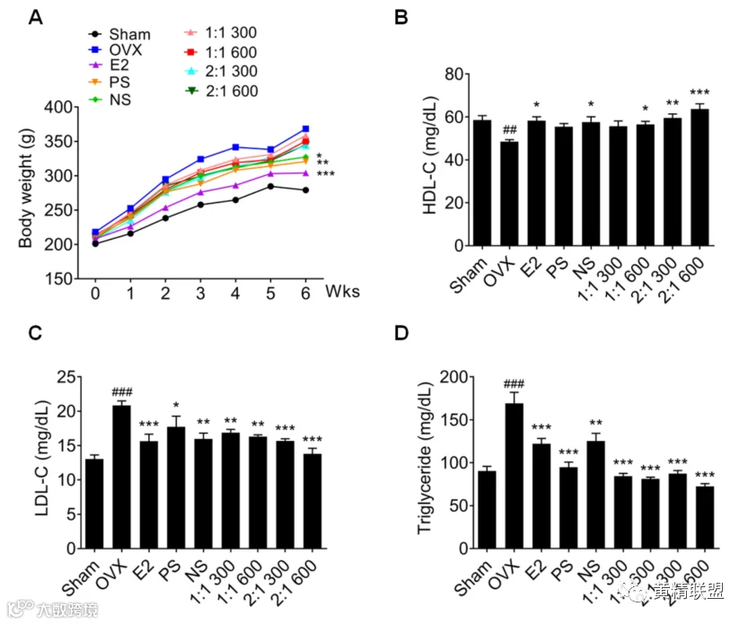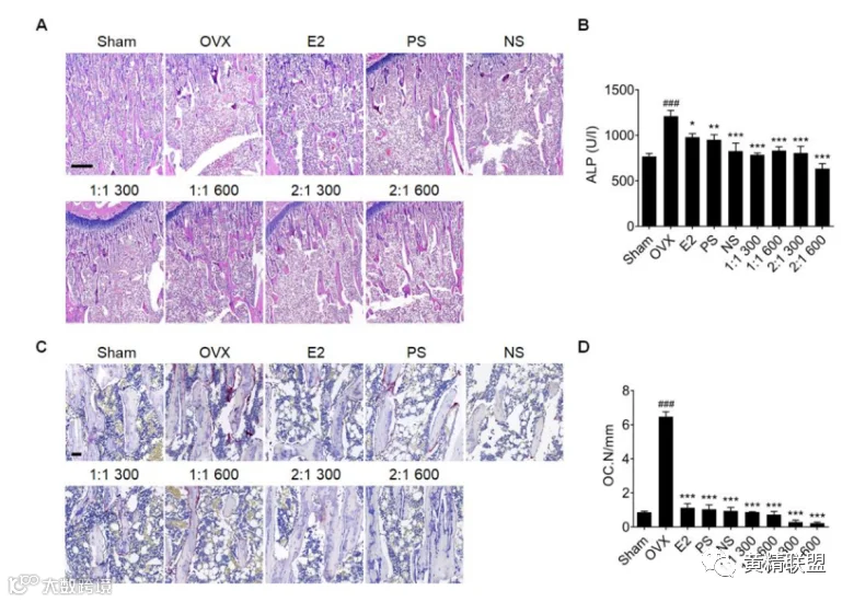 肥胖和低血脂代谢是更年期其他症状。该研究发现与对照组相比,复合提取物比PS或NS单独给药组减肥效果低(图3A)。但血胆固醇测量显示,复合提取物对血脂代谢的恢复作用高于单一提取物,甘油三酯也明显降低(图3B,D)。骨质疏松也是更年期综合征的症状之一,该研究发现复合提取物能抑制骨质流失且其治疗效果比单独给药组强(图4)。