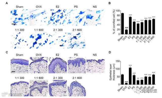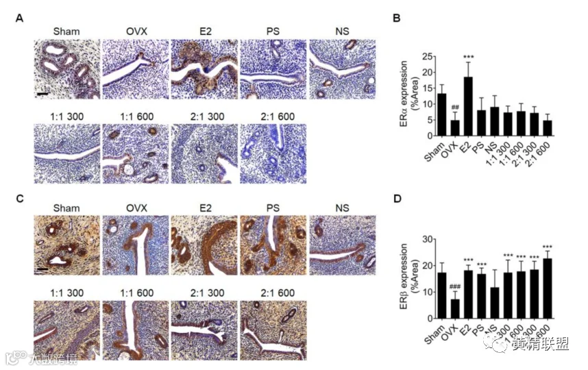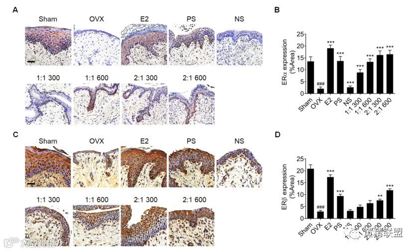 阴道干燥是女性更年期的代表性症状,一般发生在阴道上皮细胞中的角质细胞数量减少的时候。该研究发现PS和复合提取物在抑制阴道组织角质细胞减少的效果要高于单独使用NS (图1)。而且,复合提取物浓度越高、PS比例越高,改善效果越好。雌激素受体α (ERα) 和雌激素受体β (ERβ)是调节雌激素(E2)合成的关键受体,具有保护心血管系统和促进卵巢发育和功能等作用。阴道上皮细胞层数增加会使ERα和ERβ表达增加。该研究发现各给药组ERα水平均较高(图2A,B)。然而,ERβ表达仅在PS和2:1混合组增加(图2C,D)。上述结果表明,PS对阴道干燥的改善作用更为显著,且与单独给药相比,与NS复合给药具有互补作用。