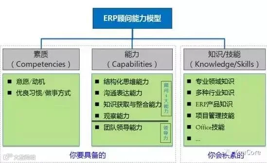 两人后续发展的差距在上面这段聊天中就拉开了。现任总经理的这位其实有整理一份顾问能力模型图(如下图),因此他能够将项目实际工作跟这个能力模型图做比对,将自己做得不到位的地方在能力模型图中找到对应的点(知道与高层对话、监督客户工作进度属于项目管理中干系人管理和进度管理的内容),从而有目的地找方法、途径去弥补(找一本项目管理的书系统学习)。