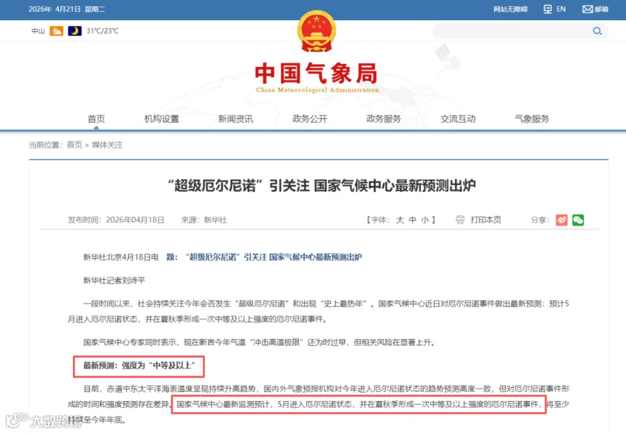 据国家气候中心最新预测,2026年5月将进入厄尔尼诺状态,并在夏秋季形成一次中等及以上强度的厄尔尼诺事件,预计至少持续至今年年底。