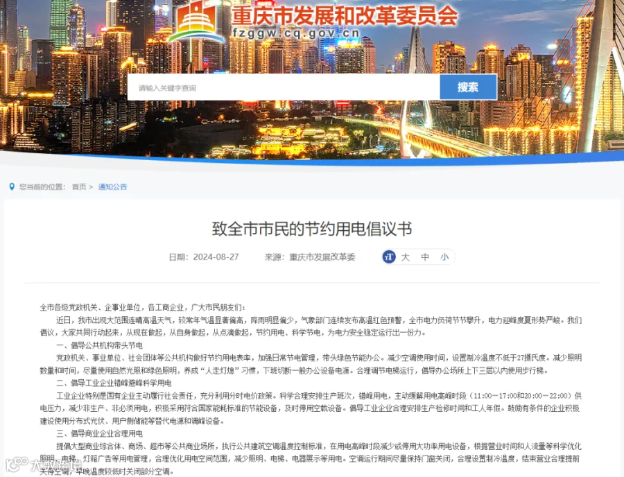 8月27日,重庆市发改委发布了《致全市市民的节约用电倡议书》,倡导公共机构带头节电、工业企业错峰避峰科学用电、商业企业合理用电等,做到低碳节能,缓解供电压力!