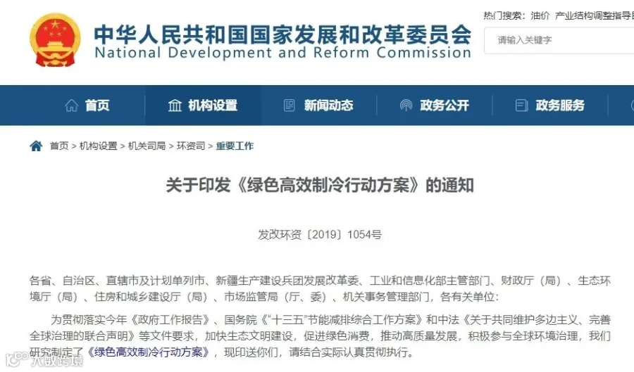 2019年,国家发改委等七部委联合印发了《绿色高效行动制冷方案》(以下简 称:方案),其中提出,到2030年,大型公共建筑制冷能效提升30%,制冷总体能效水平提升25%以上,绿色高效制冷产品市场占有率提高 40%以上。