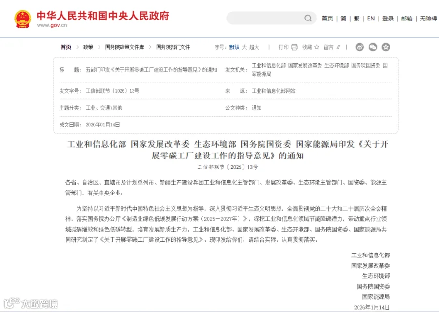 1月14日,工信部等五部门联合印发 《关于开展零碳工厂建设工作的指导意见》,标志着全国范围建设正式开启。