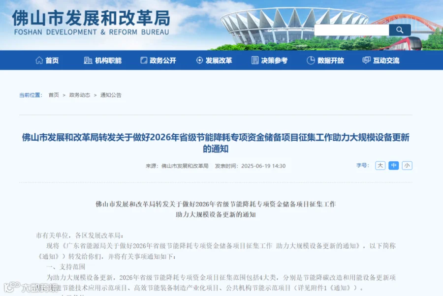 广东省佛山市已启动 “2026年省级节能降耗专项资金储备项目” 征集工作,明确支持 “节能降碳改造和用能设备更新项目”。