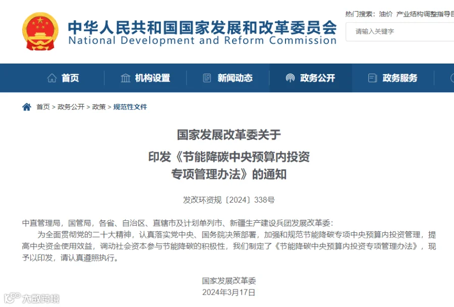 近日,国家发改委发布《节能降碳中央预算内投资专项管理办法》。
