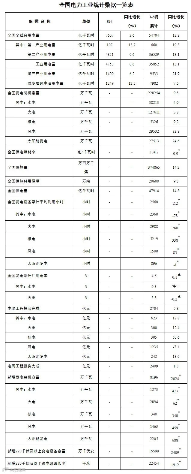 注:1.全社会用电量为全口径数据,全国供电量为调度口径数据。2.“同比增长”列中,标*的指标为绝对量;标▲的指标为百分点。