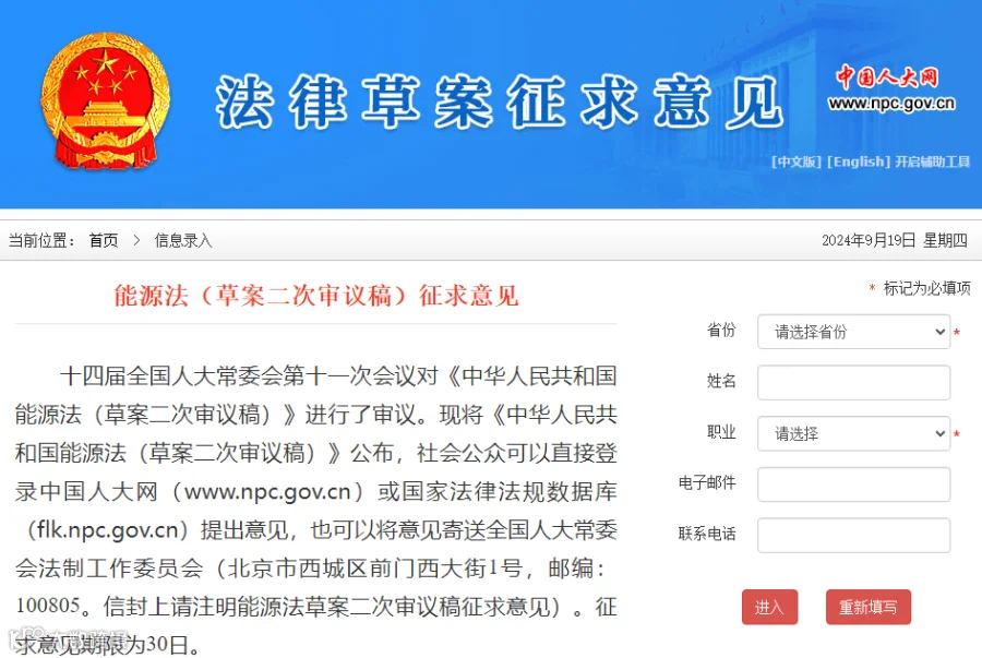9月13日,十四届全国人大常委会第十一次会议对《中华人民共和国能源法(草案二次审议稿)》进行了审议。