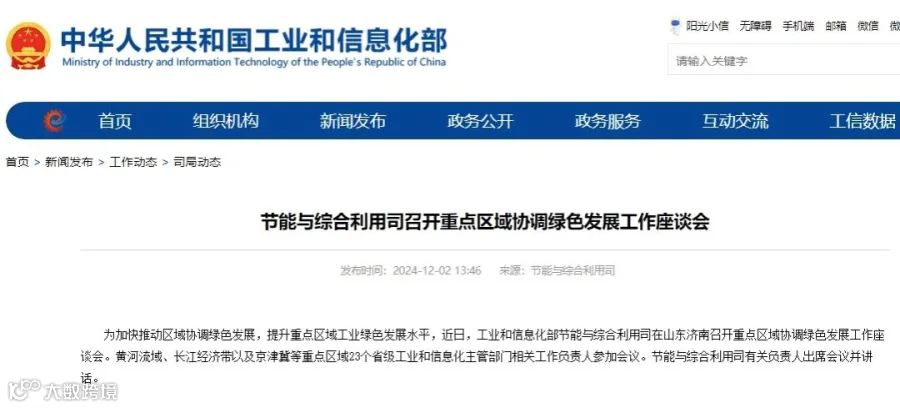 12月2日,工信部节能与综合利用司召开了重点区域协调绿色发展工作座谈会。