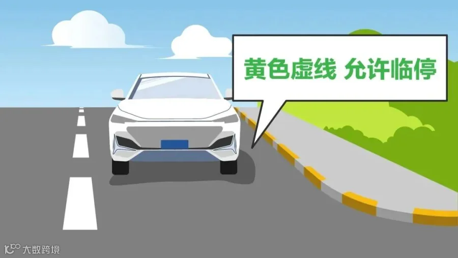 路缘石上标注为黄色虚线:表示“禁止路边长时间停、放车辆,但允许装卸货物或上下人员等的临时停放”。