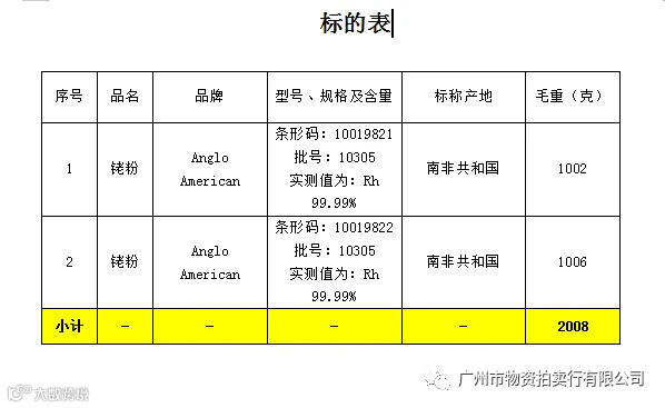 一批贵金属(铑金)等罚没财物共2件,毛重约2000克(标的交接按现状,以实物为准),整体拍卖,保证金16.3万元。