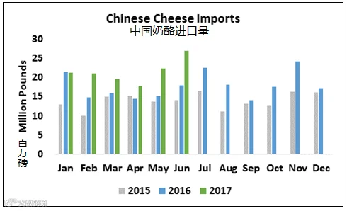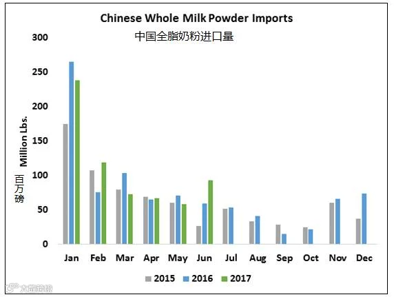 6月份中国奶粉进口量出乎意料地强劲。中国进口了9300万磅全脂奶粉(WMP),比去年增长57%。6月份中国进口的脱脂奶粉(SMP)数量近4800万磅,相比去年涨幅达45%。据每日乳业报道,根据每日乳业报告,“一些零星报告表明,由于在农场盈利能力水平有限,中国的牛奶产量低于去年水平,暗示今年中国可能需要更多地依赖于进口。”这情况也已经在中国异常火爆,这可能加剧降低国内生产。