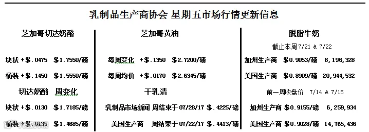 乳制品市场在这个暑假也有点欣狂。芝加哥商品交易所现货桶装切达奶酪价格飙升至两个月新高,收于1.555美元/磅,一周内上涨14.5美分。块状奶酪虽涨幅较小,但到达了一个更远的里程碑。现货块状奶酪价格上涨4.75美分,攀升至4.75美元/磅,创今年2月初以来的新高。芝加哥商品交易所现货黄油也不甘示弱,价格跃升至2.72美元/磅,上涨13.5美分,创2015年12月以来的新高。只有奶粉市场价格无法成功反弹。现货脱脂奶粉(NDM)跌价1.25美分,收于86美分/磅。大多数四级奶期货合约在本周获利15-20美分。三级奶期货表现更强劲,9月合约价格上涨70美分。