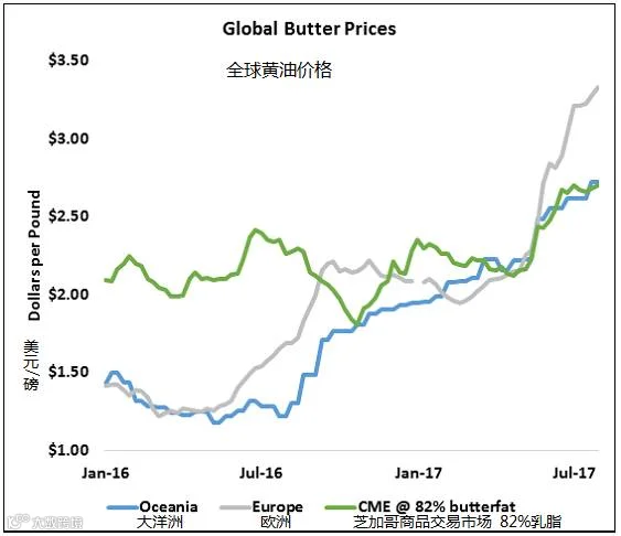 由于中国和其他地区的需求有所改善,紧张的黄油市场价格高涨。恒天然集团再次上调2017到2018年度的预估价为 6.75新西兰元/公斤牛奶固形物,比5月份的预估价6.50新西兰元/公斤牛奶固形物的价格有所增加。包括股息在内,这使新西兰牛奶价格大致相当于三级奶16美元/100磅的价格,这是过去10年来的第三高价。