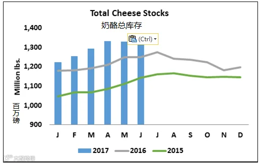 在经历了几个月巨大产量和低迷需求的焦虑之后,奶酪市场从冷藏报告中获得了令人欣慰的提振。美国农业部将其5月31日的奶酪库存量下调超过1000万磅,导致4月到5月的奶酪库存量下跌,而不是预测中的库存上涨。该机构公布称,6月30日的奶酪库存量为13.2亿磅,比5月份下跌了1300万磅。生产商通常在5月份和6月份增加奶酪库存。事实上,他们今年这两个月都没有出现这种情况,这比在供应充分的奶酪市场上的预期要好得多。奶酪库存量比一年前增加了5.3%。