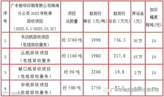 一、拍卖时间及标的:2023年5月10日10时按顺序拍卖标的1、标的2、标的4、标的3(每个竞买人只能竞买标的1书边纸、标的2丛纸、标的4杂纸其中一个标的,标的3破口纸回收项目可与其他三种联合竞买)。