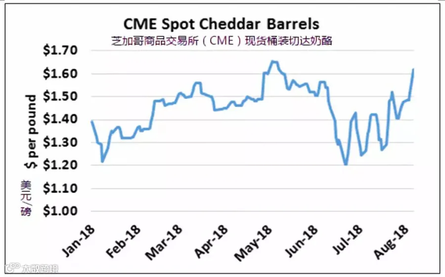 乳清市场持续走高。芝加哥商品交易所(CME)现货乳清粉价格收于44.25美分,创历史新高,较上周五上涨0.75美分。2018年9月至2019年8月的期货乳清价处于新的合同高位。这有助于期货三级奶合同价达到自六月中旬以来的最高价位。本周大多数三级奶合同价格都有15~20美分的上涨,九月三级奶的价格上涨45美分,收于16.13美元/100磅。