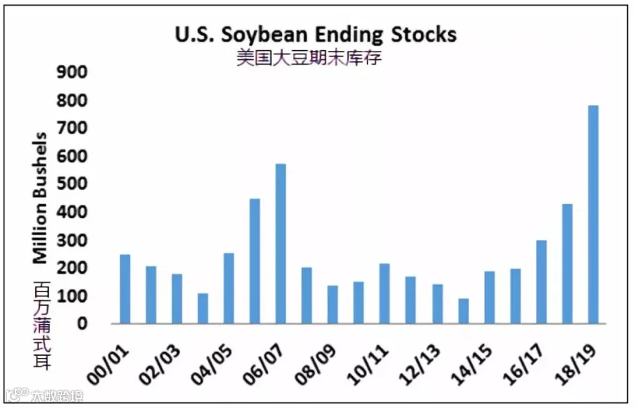 美国农业部预计大豆产量平均为51.6蒲式耳/英亩,比7月预测的增加3.1蒲式耳。这仍然低于2016年创下的52蒲式耳的记录,但随着创纪录的种植面积,农民预计将创下45亿9000万蒲式耳的创纪录产量。美国农业部也提高了国内和出口需求的估计。尽管中国需求大幅萎缩,但今年夏季美国大豆出口仍维持增长,贸易已有所缓解。然而,中国是在收获季节通常是一个更大的买家,在未来几个月,大豆市场将会感觉到疲软。美国难以通过增加其他地方的销售来弥补中国的不足。在这种情况下,美国农业部仍雄心勃勃地声称将在未来一年出口20亿6000万蒲式耳的大豆。即使有刚劲的需求预测,美国的大豆库存也将达到令人担忧的水平。美国农业部要求本季末库存为7亿850万蒲式耳,高于本季4亿3000万蒲式耳。如果中美双方无法达成协议,美国的大豆库存量将更加庞大。