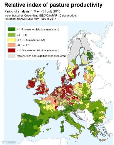 北欧也非常炎热,这必然影响当地的牛奶产量。欧盟委员会报告指出,在德国西北部、丹麦、比利时、荷兰和卢森堡,自1999年欧盟委员会开始为欧盟保留记录以来,牛奶的产量从未这么糟糕。英国、爱尔兰、法国和波罗的国家的牛奶产量是近十年来最严重的。虽然近期的降雨有所帮助,但在一些地区,农民将不得不去寻找足够的饲料原料以维持到明年春天。