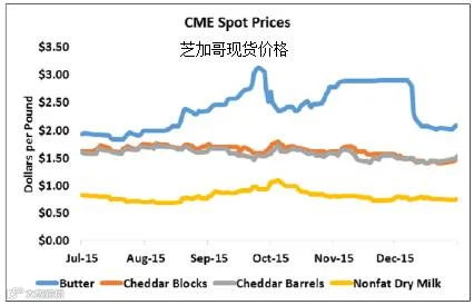 现货脱脂奶粉(NDM)价格回落,下滑至75.5美分,与上两周相比下跌一分钱。芝加哥现货黄油本周上涨本周较晚,最终价格为2.08元/磅,比上两周上升2美分。自2014年中期,很多黄油消费者由于想要等到更低的价格没有等到,反而亏得焦头烂额。可是尽管美国黄油相对全球价格仍然有较大的溢价,许多人认为最近的崩溃是个买入的机会。再加上加利福尼亚州的牛奶产量出现赤字,很可能帮助黄油市场上的投标竞争。本周二月至七月黄油期货合约价格创下新高。但是,受奶粉市场的影响,大部分第四类期货出现双位数的跌幅。