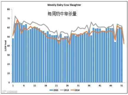 根据前两周的报道,奶牛宰杀量已经比去年高了一点。根据最近两周的数据,2015年的奶牛淘汰率比2014年高3.7%。