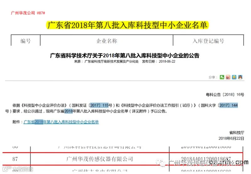 广州华茂传感仪器有限公司经省科技厅汇总复核、公示等筛选程序成功入选广东省2018年第八批入库科技型中小企业名单。