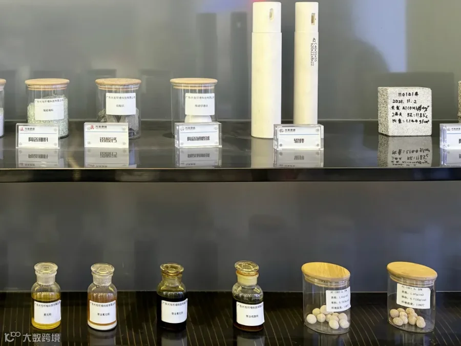 在广东兴发环境科技有限公司一楼展厅显眼处,铝灰、惰性残渣、氧化铝粉、陶瓷研磨球等样品被整齐陈列。