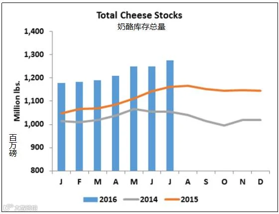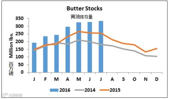 乳制品市场遭受着越来越大的库存重压。周一,美国农业部公布的7月黄油库存量为3.331亿磅,较去年同期上涨了31%,达到了10多年来的最大库存量。夏季生产进入低迷,黄油库存通常从6月到7月开始受到影响。但今年库存量竟增长了近五百万磅。经历了两年来一直以以令人困惑、担忧的高价购买,黄油买家最终还是认为自己有足够的耐心承受这个风险。