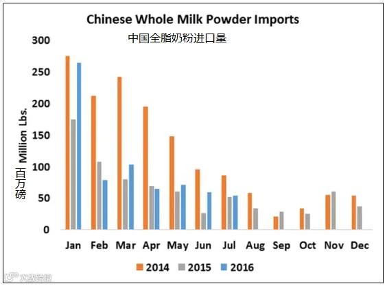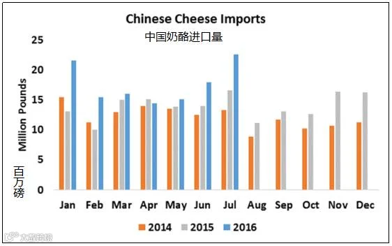 中国今年7月的奶酪和凝乳进口量创纪录达2260万磅,比去年增加了36.6%。今年至今,中国奶酪和凝乳的进口量比2015年增长26.4%。新西兰和澳大利亚,作为中国第一和第二大的两大供应商,对今年中国的奶酪出口量都增加了近34%。由于美国国内价格上涨,美国对中国奶酪的输出量比2015年的头7个月下降了27.3%。