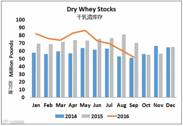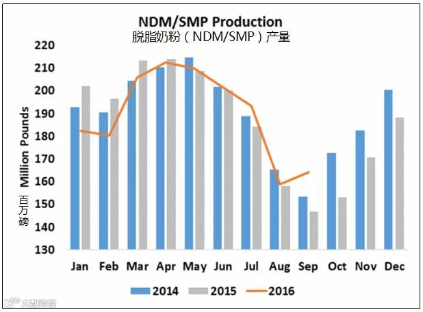 因为出口量的增加,八月至九月脱脂奶粉(NDM)的库存有所下降。但由于九月脱脂奶粉的产量出现异乎寻常的增大,环比下降小于正常8%的下降幅度。9月30日,脱脂奶粉的库存达2.161亿磅,同比增长2.1%。创14个月以来最大的同比增长。