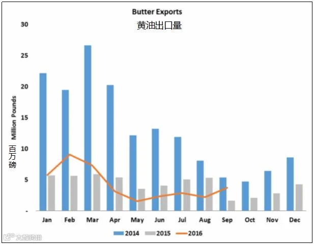 更多黄油价格竞争带来的影响才刚刚开始。今年9月,黄油的出口量超过300万磅,创13个月的新高,比2015年9月那微不足道的出口量高出三倍多。不过与过往相比,并没有让人印象深刻,黄油进口量回落至420万磅,总体状况再次因为进口量受限。鉴于目前的价格,出口量可能持续增高,而进口量则具有持续下跌的趋势。