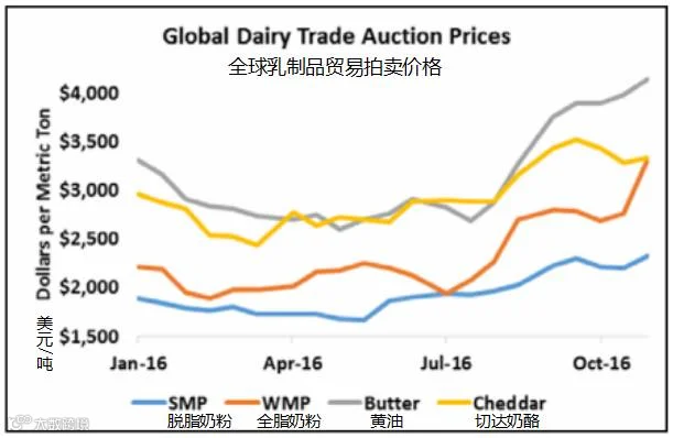 尽管海外市场价格持续上涨,但美国的脱脂奶粉市场未能引起很大的关注,可能是出于产量与往常相比有所增加的缘故。在本周全球乳制品贸易拍卖中,全脂乳粉(WMP)的拍卖价格飙升19.8%,脱脂乳粉(SWP)的拍卖价格也跃升6.5%。高企的切达奶酪价格有少许上涨,黄油的价格跃升4%。全球乳制品贸易指数上涨11.4%。