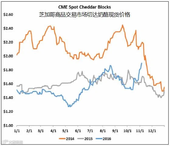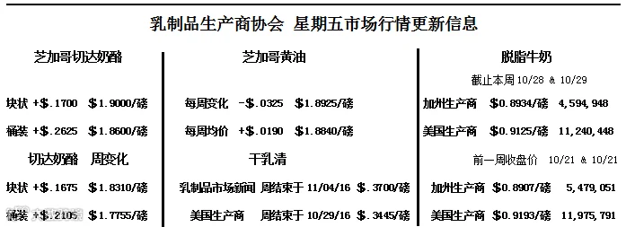 这是芝加哥具有历史性意义的一周。芝加哥小熊队在近一个多世纪以来首次取得世界职业棒球大赛的冠军,艾迪生街陷入了狂欢。在拉萨尔街,虽然对其没有那么重要的历史意义,但街上人们依然热烈庆祝。随即,芝加哥商品交易所中块状切达乳酪的现货价格收于1.90美元/磅,跃升了17美分,创近两年来最高。这也是自2015年1月以来,首次在现货黄油市场中出现块状切达乳酪溢价。芝加哥商品交易所的桶装切达奶酪也不甘示弱,现货价格为1.86美元/磅,飙升了26.25美分,创十年来最大的单周涨幅。
