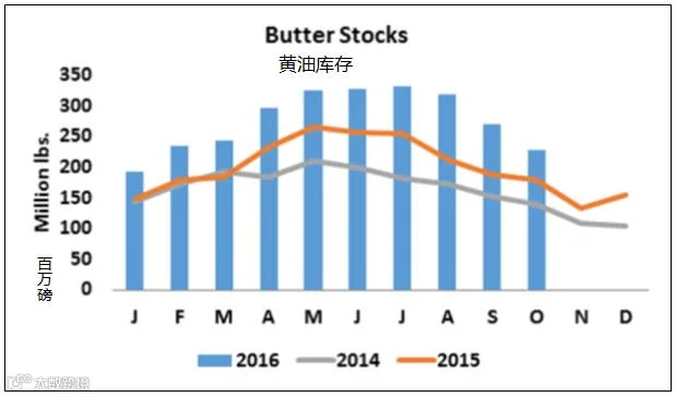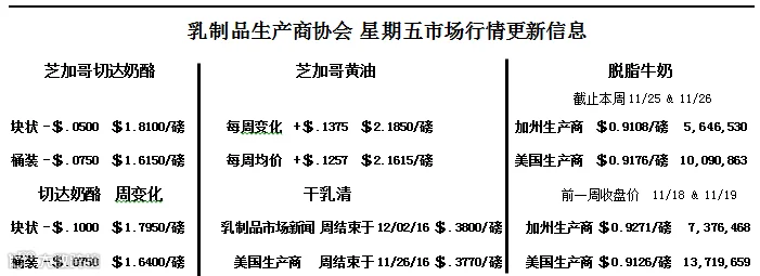 现货黄油和切达奶酪的公开叫价交易会在未来几个月重蹈以前的覆辙。今天,现货黄油收盘价为2.185美元/磅,在夏天价格成功反弹后就未出现如此高价,比上两星期还高出约15.5美分。四级奶期货收益大幅增长;1月合约价在感恩节前那个星期五上涨近1美元。黄油期货价的飙升很大程度上受10月份黄油库存大幅跌降的影响。黄油月底库存总计为2.277亿磅,比9月份跌幅15.4%,但仍比去年同期涨27.4%。然而,如果需求继续以目前的速度清空库存,年底的黄油库存量将下跌至去年同期水平。来自二级生产商和加拿大买家对奶油的强劲需求将进一步加速今年黄油库存量的季节性下跌。