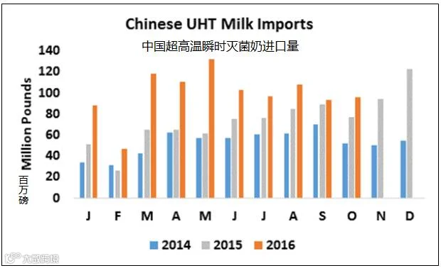 今年10月,中国奶粉进口量总计为4240万磅,略低于去年低迷的成交量。然而,中国的奶酪进口量却比去年同期上涨39%。中国10月份进口的UHT奶(超高温瞬时灭菌奶)和乳清分别比去年同期的涨幅为24.6%和9.1%。